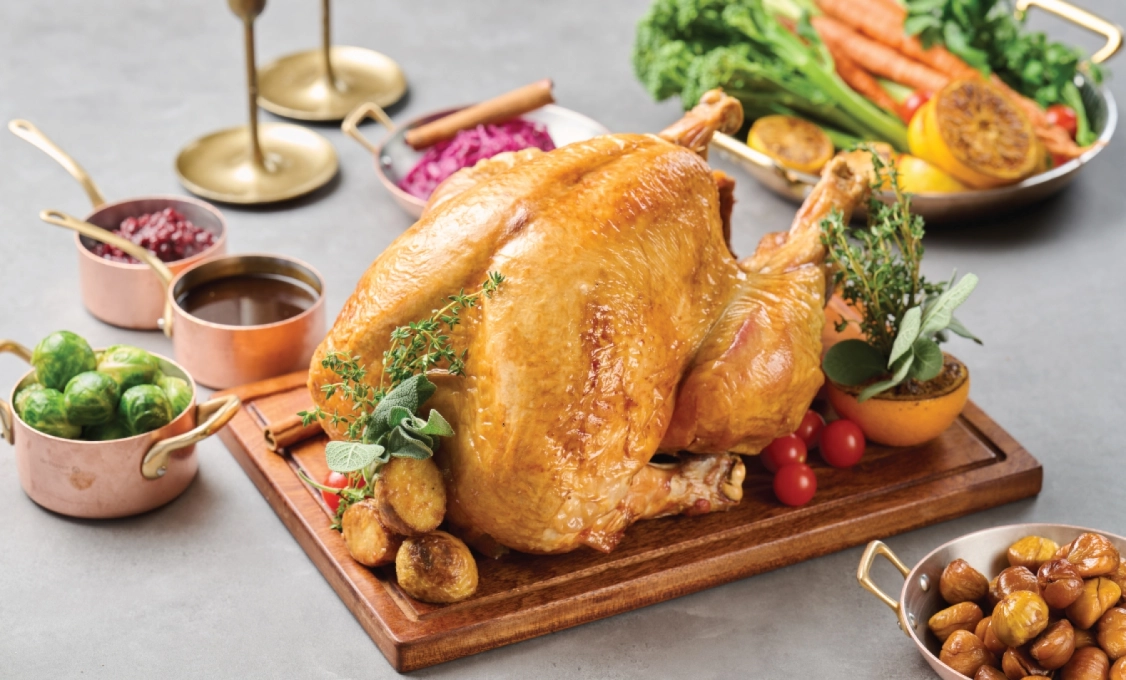 Glazed Chestnuts, Brussels Sprouts, Braised Red Cabbage, Stuffing, Cranberry Sauce, Giblet Sauce.